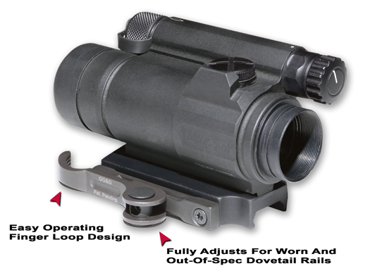 | Untitled document Only for military and law enforcement customers. Need an M4 mounting base with Quick Detach capabilities? The Aimpoint CompM4 is the latest version of the US Army's M68 CCO (Close Combat Optic) and is capable of withstanding the roughest combat environments. We thought it needed a QD mounting base that matched its exceptional durability, so we developed the GG&G Aimpoint CompM4 Accucam Quick Detach Mounting Base. This mount provides a degree of tactical flexibility highly valued in urban combat. The Aimpoint CompM4 Accucam Quick Detach Mounting Base allows the end user to quickly switch between optics and still maintain "on target" repeatability. The Aimpoint CompM4 is a rugged optic, however if by chance it should fail, by using the Accucam the end user can quickly remove it and deploy the weapons back up iron sight. By using the Aimpoint CompM4 Accucam QD Mounting Base, the optic can quickly be installed on a dovetail rail by rotating the Accucam Cam Lever to the locked position. It can then be quickly removed by rotating the Accucam Cam Lever to the unlocked position. The unique cam design is fully adjustable to fit both Weaver and MIL-STD-1913 dovetails, and allows you to adjust the tension to accommodate out-of-spec or worn dovetails. In tests, the Accucam Locking Lever System has shown to be repeatable to 1/2 MOA. The unique finger loop design is easily operated, even with a gloved hand and the rounded design is ergonomic and virtually snag proof. The new GG&G Aimpoint CompM4 Accucam Quick Detach Mounting Base is manufactured from solid billet 6061 T6 aluminum alloy and Type III hard-coat anodized matte black to meet mil-spec. The Accucam mechanism is manufactured from solid billet 4140 steel and manganese phosphated matte black to mil-spec.