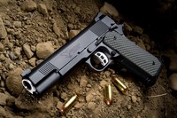 The rear of the slide is hand serrated, along with a serrated slide top, that gives the Enforcer a classy custom appeal. A serrated tactical magazine release and serrated Heinie Slant Pro Straight Eight Night Sights round out the look. (Novak Three Dot Night Sights are also an option at no extra cost.)